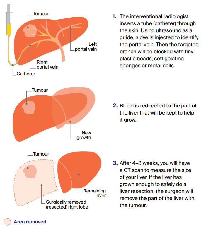 Sometimes, the surgeon needs to remove so much of the liver that the remaining portion may not be large enough to recover. In this case, you may have a portal vein embolisation (PVE) about 4–8 weeks before the liver resection.